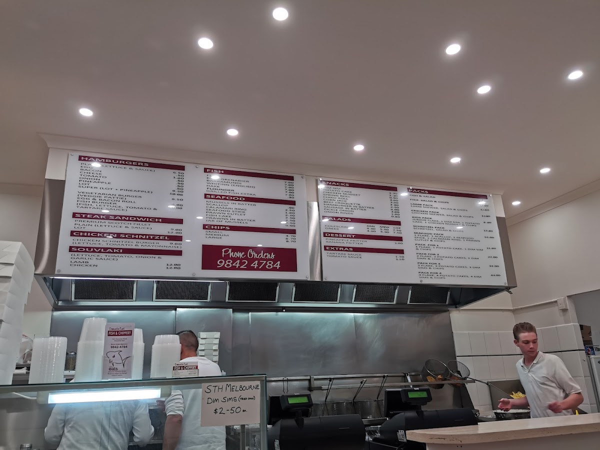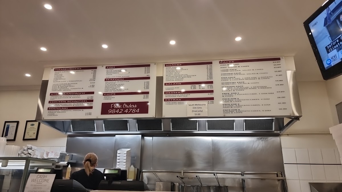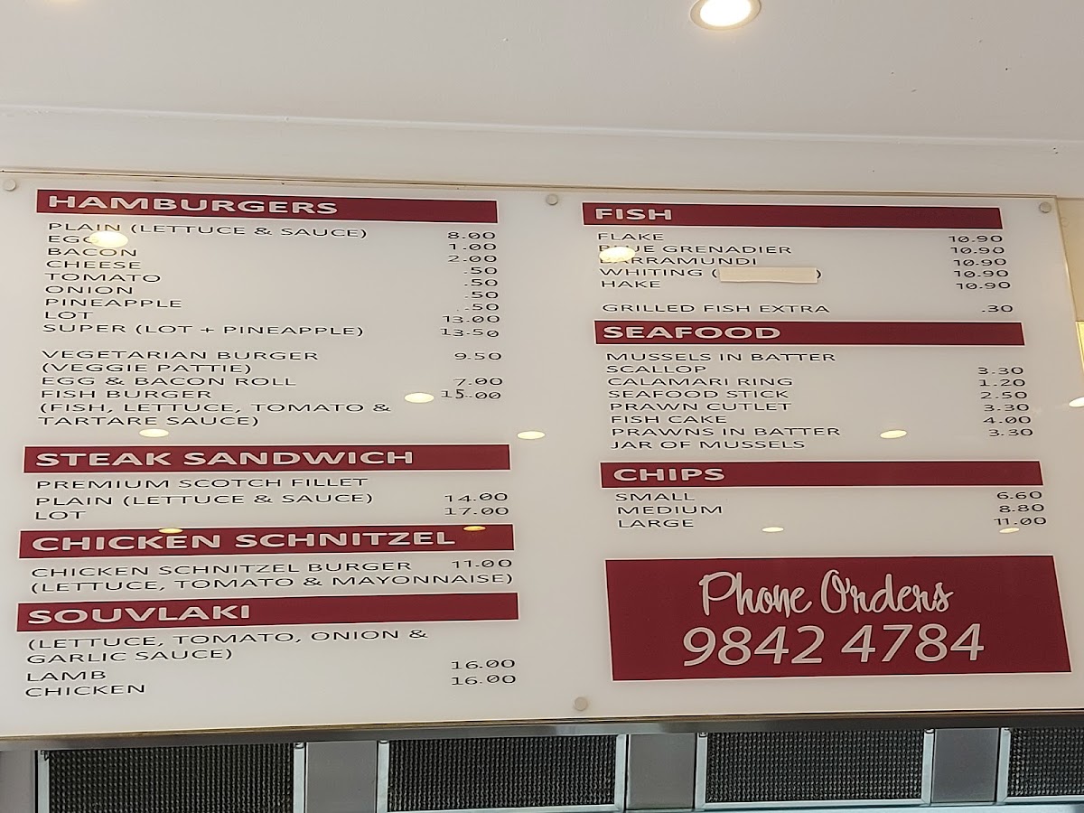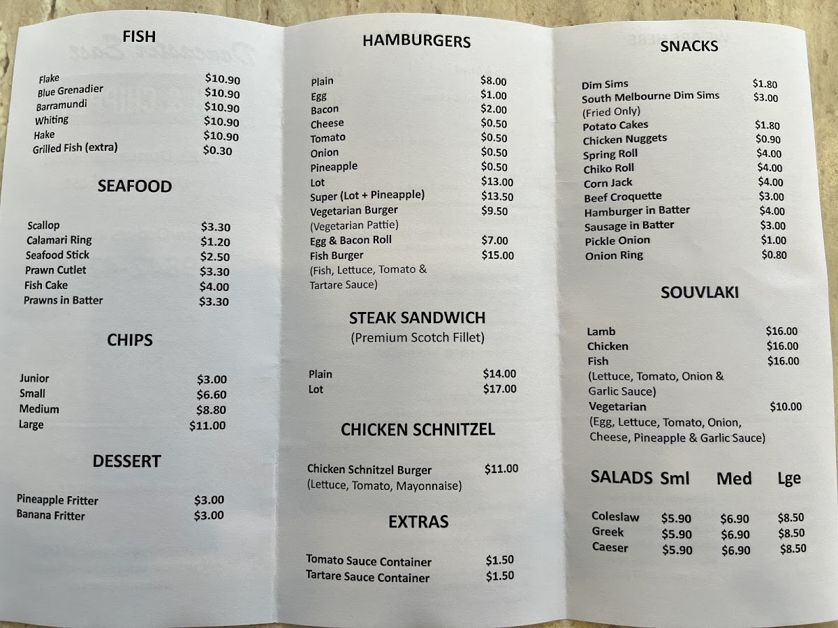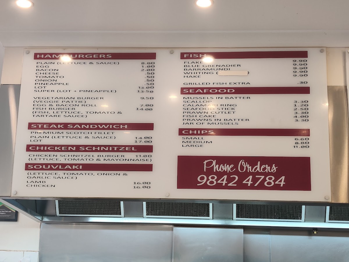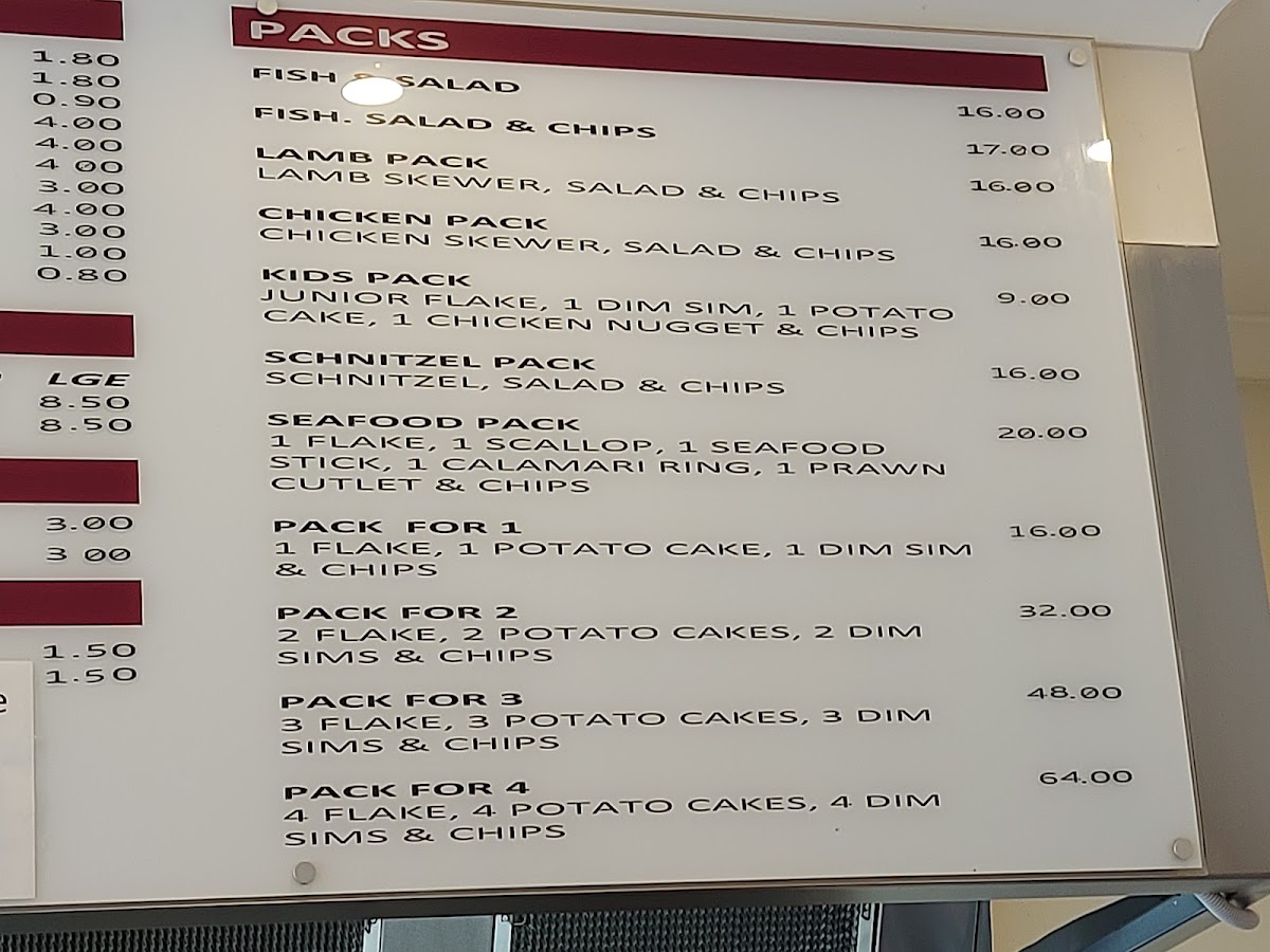 From a reviewer's perspective, the menu at Doncaster East Fish & Chippery is a diverse and satisfying mix of classic fish-and-chip fare and complementary options. The seafood selection is robust, featuring favorites like Flake, Pve Grenadier, Barramundi, Whiting, and Hake, alongside more indulgent treats such as Mussels in Batter, Scallop, Calamari Ring, Seafood Stick, and Prawn Cutlet. For those seeking variety, the Packs-including Lamb Pack, Chicken Pack, Kids Pack, Schnitzel Pack, and Seafood Pack-offer hearty, ready-made options. Burgers are straightforward yet satisfying, with choices like Plain, Bacon, Cheese, Tomato, and Onion, while the Steak Sandwich options, from Premium Scotch Fillet to Plain or Lot, cater to more substantial appetites. Lighter additions, such as Coleslaw and Greek Salad, provide a refreshing counterpoint, and the Extras menu-including Tartare Sauce, Tomato Sauce, and South Melbourne Dim Sims-allows customization. For snack lovers, items like Dim Sim, Potato Cake, Chicken Nugget, Spring Roll, and Chiko Roll are readily available, while desserts like Pineapple Fritter and Banana Fritter finish the meal on a sweet note. Overall, the menu combines classic, familiar favorites with generous seafood options and convenient packs, appealing to both individual diners and families seeking variety at reasonable prices.